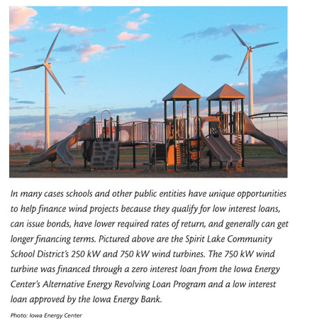 In many cases, developing a community wind project necessitates requesting a loan from a bank, much as building a new ethanol production facility does. Loan terms for the debt vary, but typically are 10-15 years for conventional bank loans and up to 20 years for bond financings. The equity investment in a project is the amount of capital that is not borrowed, but is invested directly into the project upfront. This may come from private savings or direct investment by members of a cooperative, partnership, or LLC that is interested in obtaining a desired rate of return from the project’s ongoing revenues.